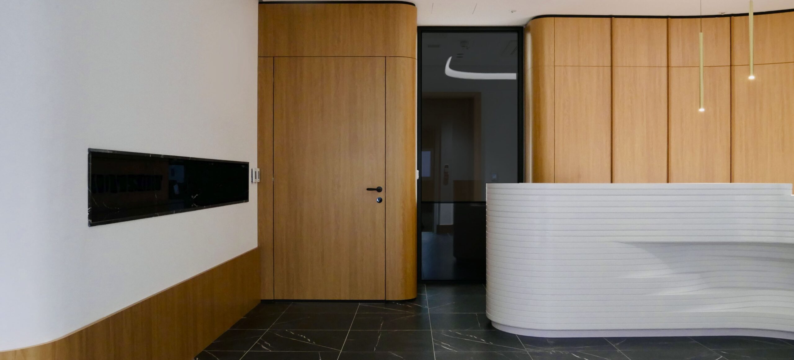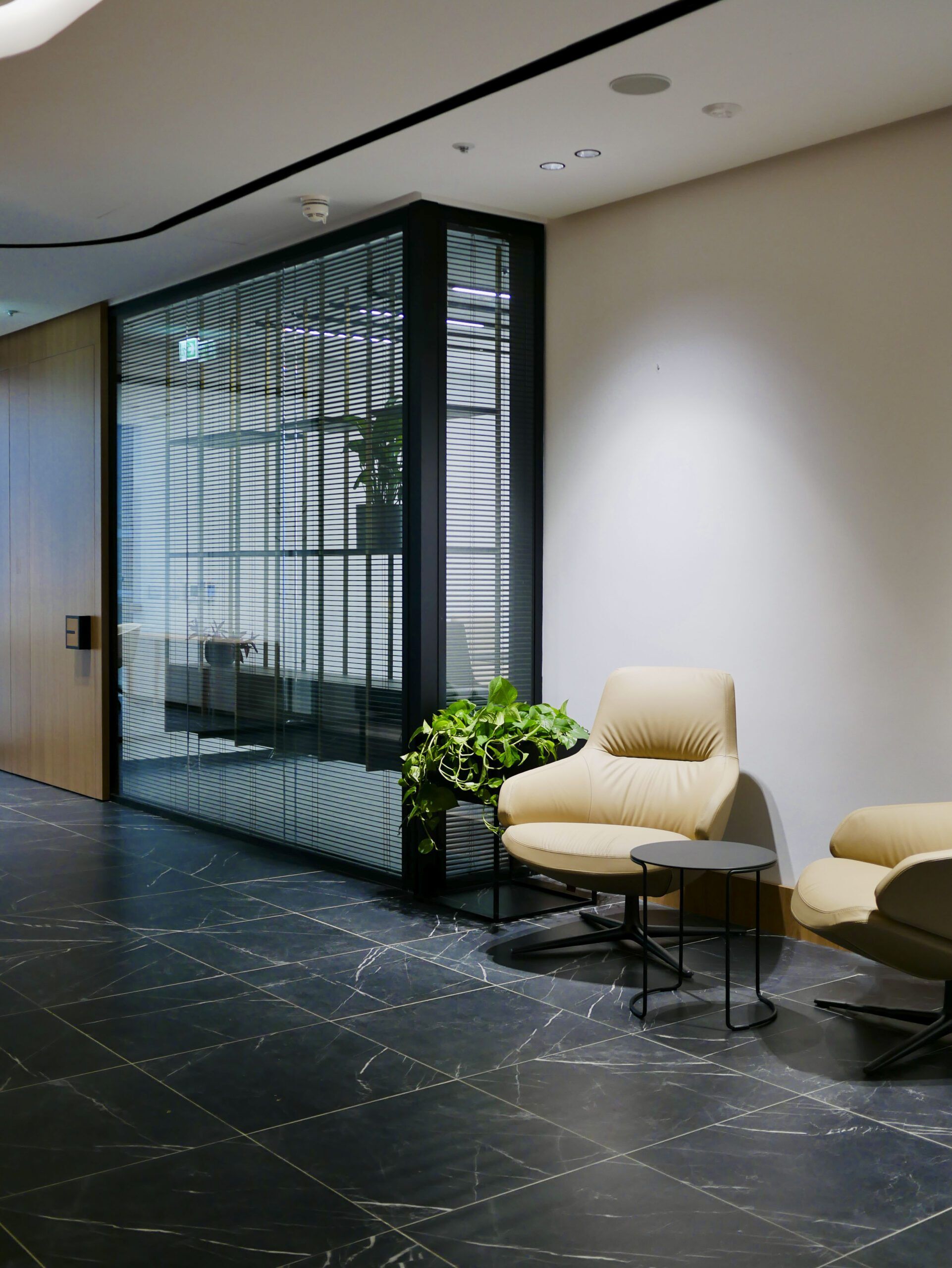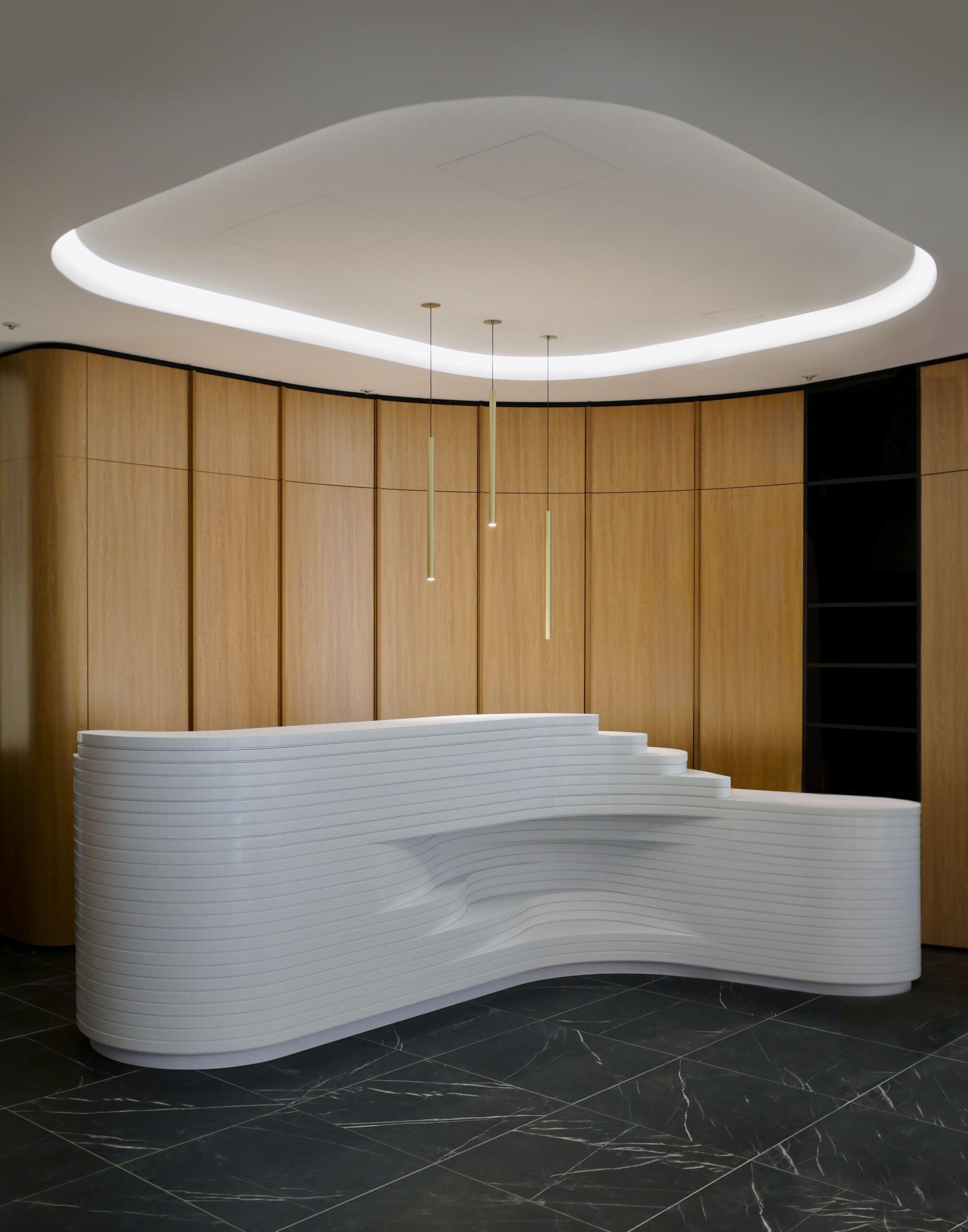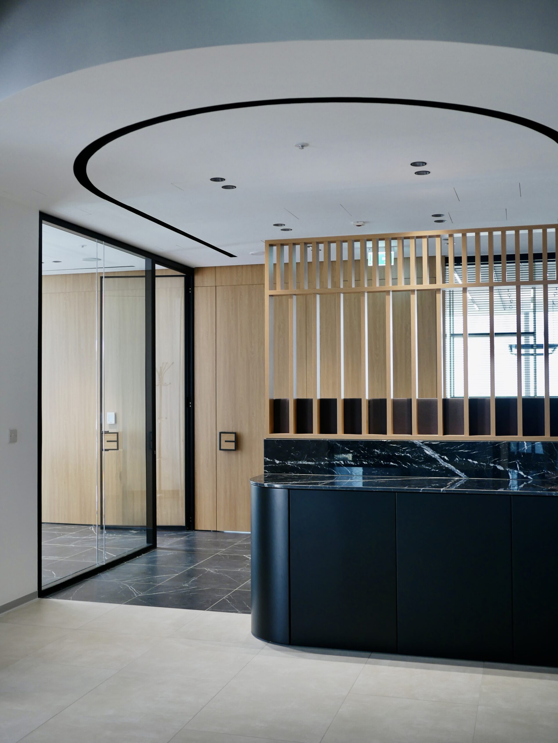 Given a unique 420 sqm space with panoramic glass walls, we used soft curves to define the layout. A “loop corridor” is the central pathway, surrounded by workspaces and amenities. It features outward-facing offices, storage, printing, and wet areas. The reception area offers access to waiting areas and boardrooms, while employee workstations and a south-facing kitchenette with a terrace are opposite. To distinguish spaces, elegant dark marble tiles and white soffits are used for guest areas, while employee spaces feature less formal stone tiles and exposed services.