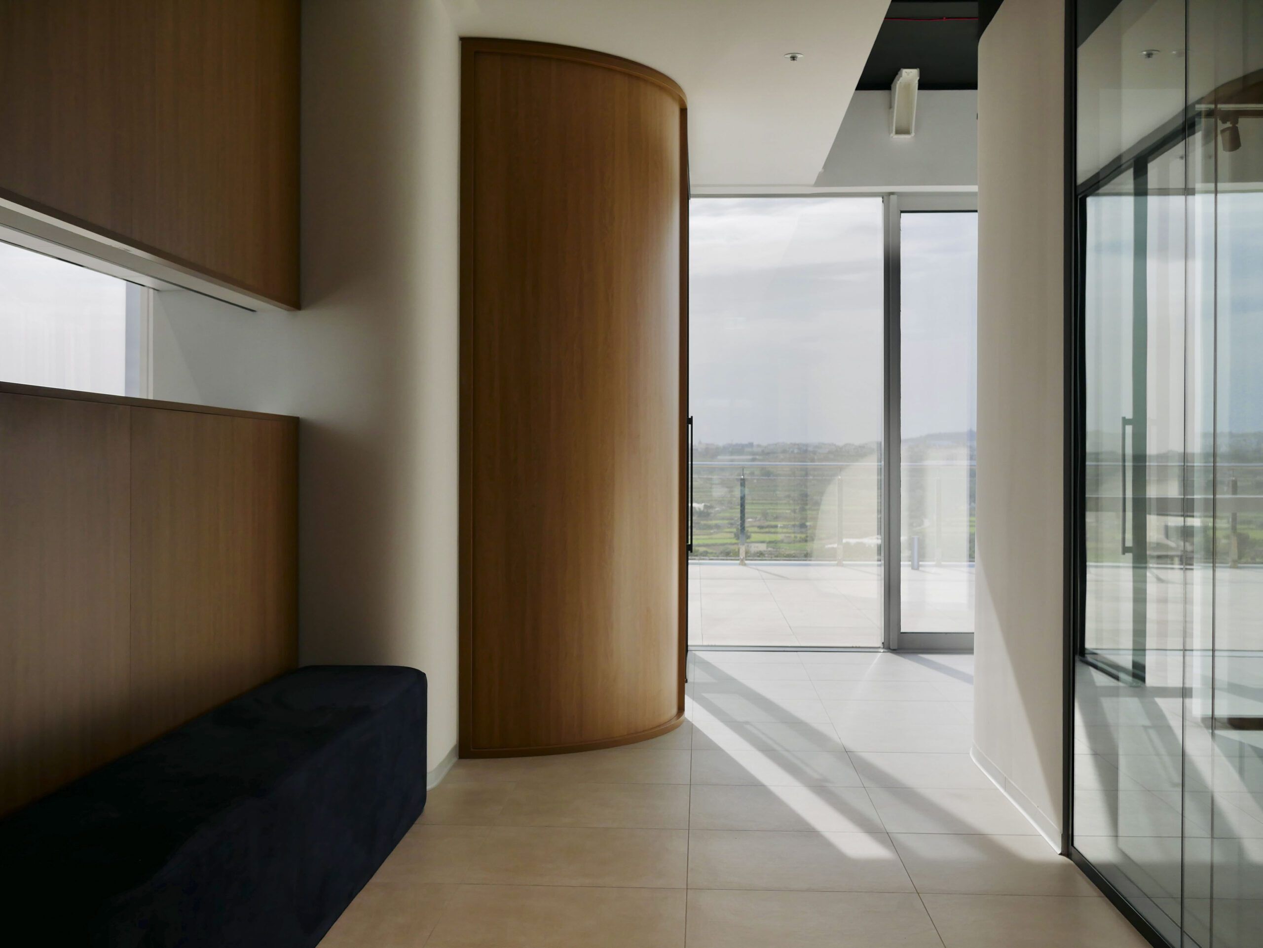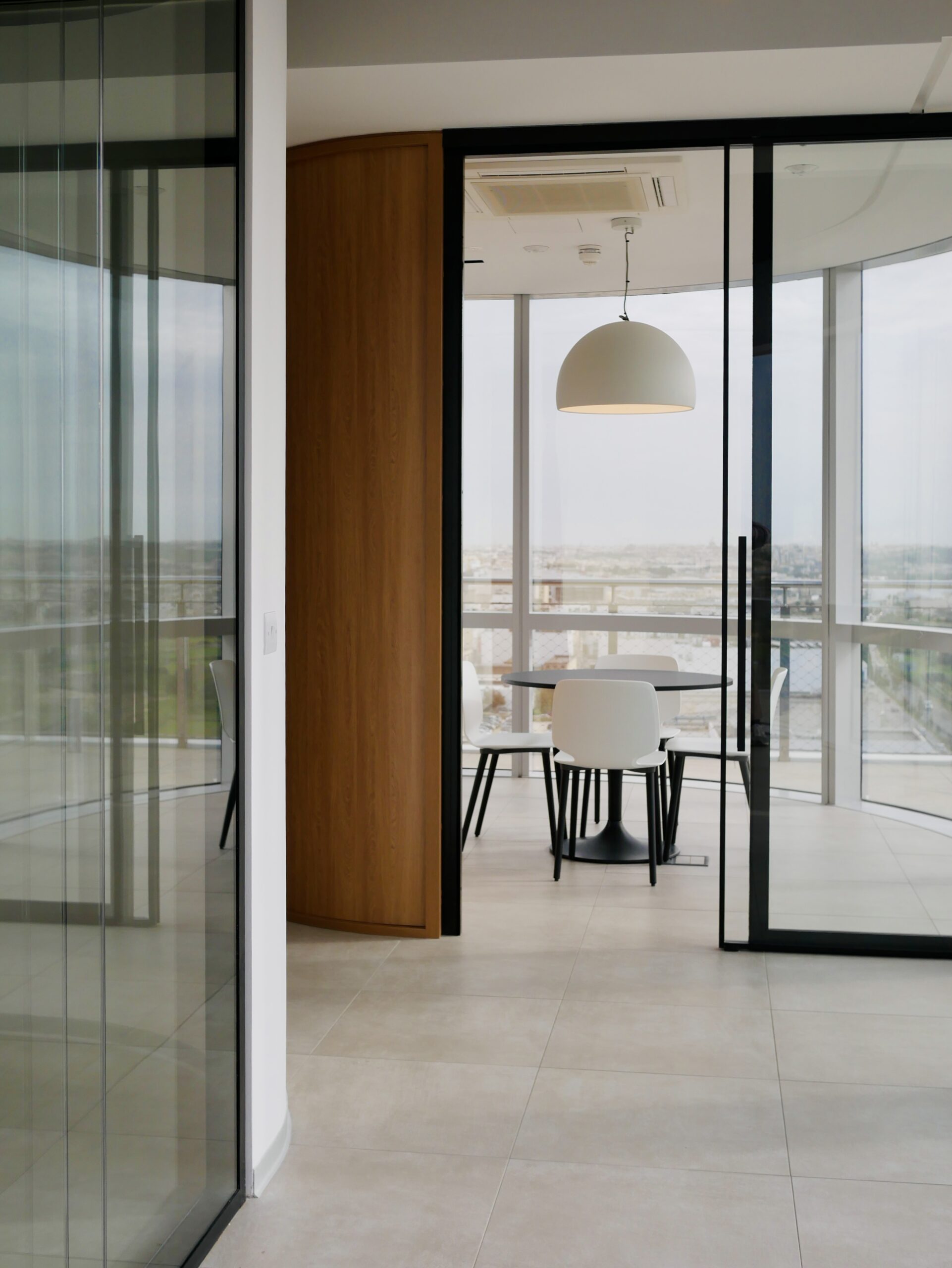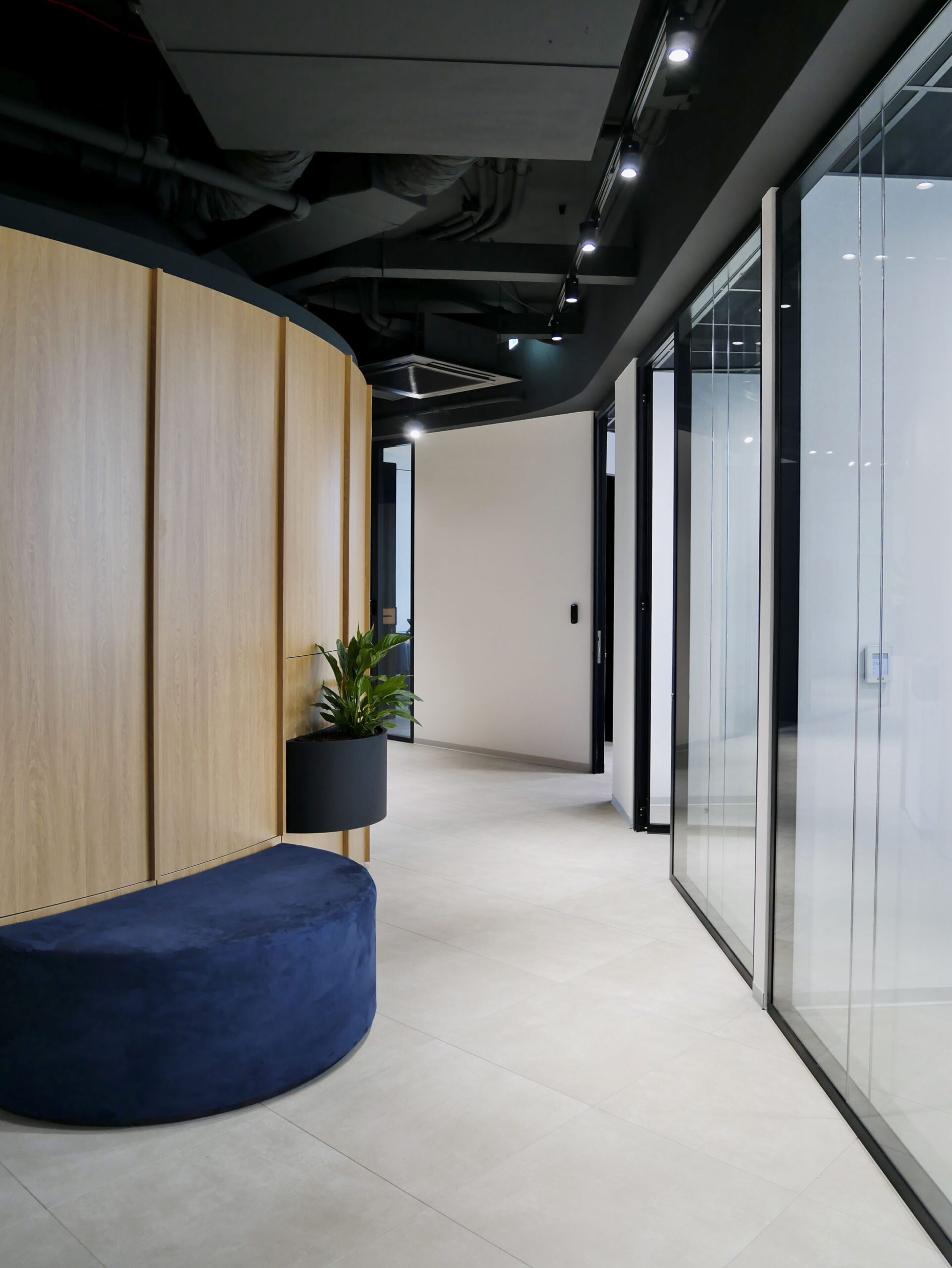 Given a unique 420 sqm space with panoramic glass walls, we used soft curves to define the layout. A “loop corridor” is the central pathway, surrounded by workspaces and amenities. It features outward-facing offices, storage, printing, and wet areas. The reception area offers access to waiting areas and boardrooms, while employee workstations and a south-facing kitchenette with a terrace are opposite. To distinguish spaces, elegant dark marble tiles and white soffits are used for guest areas, while employee spaces feature less formal stone tiles and exposed services.