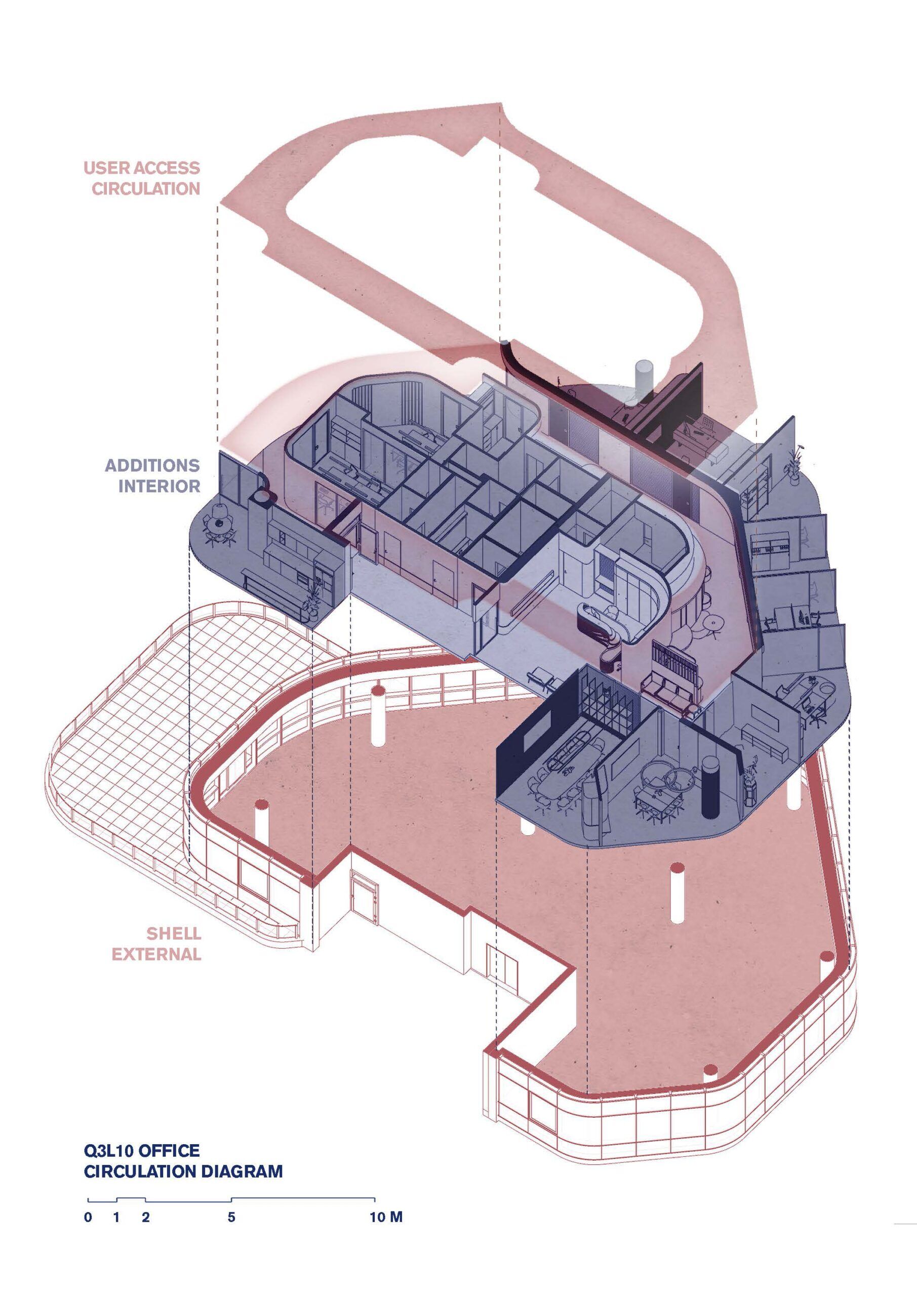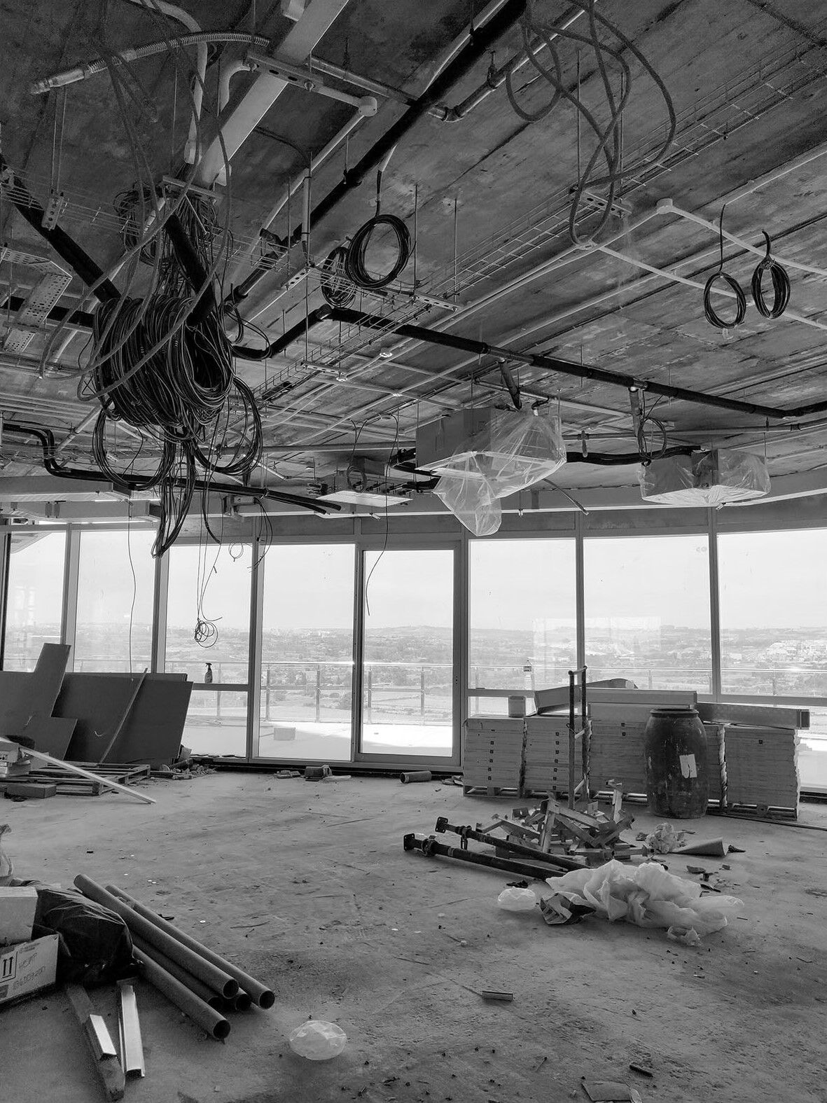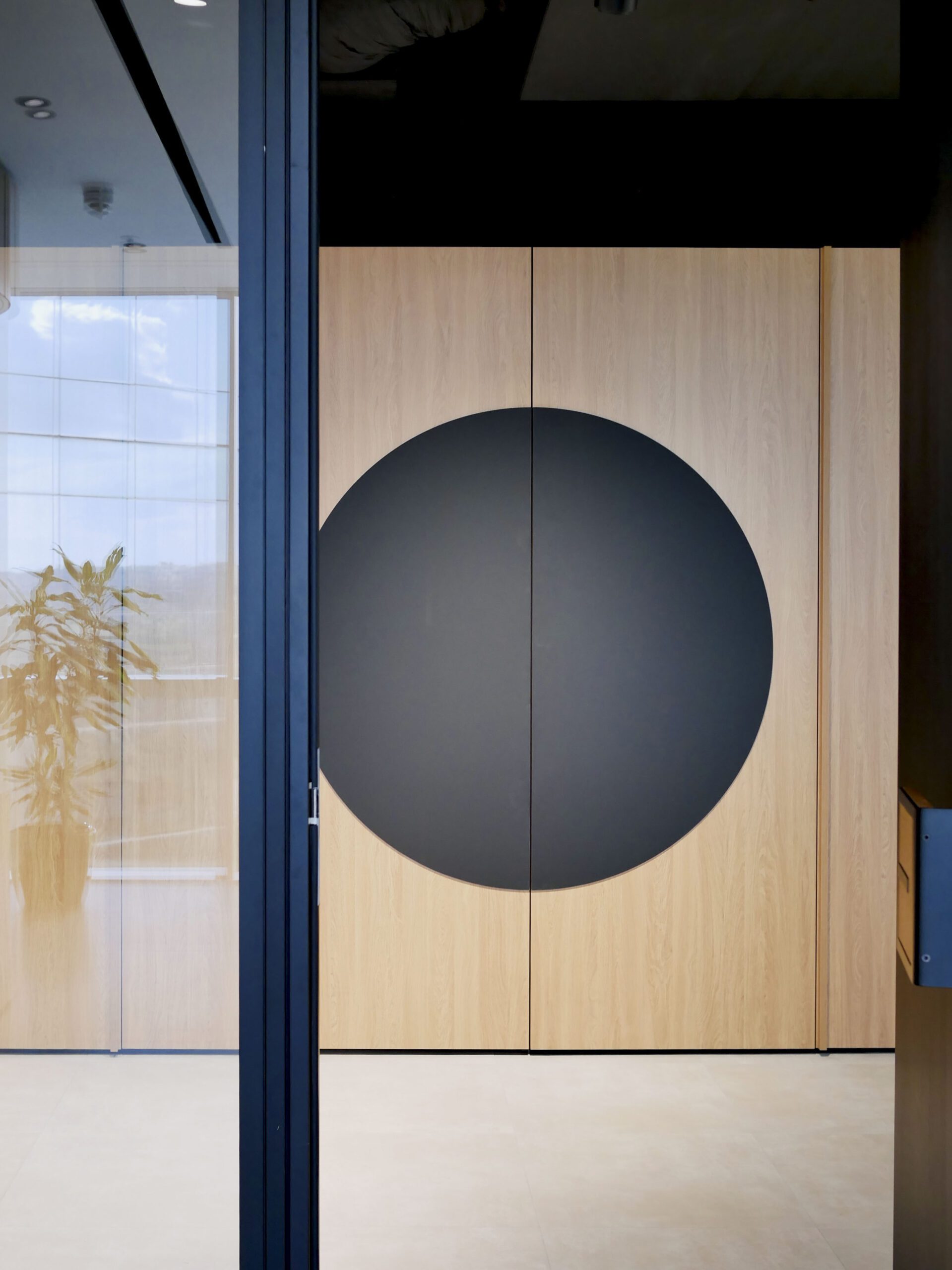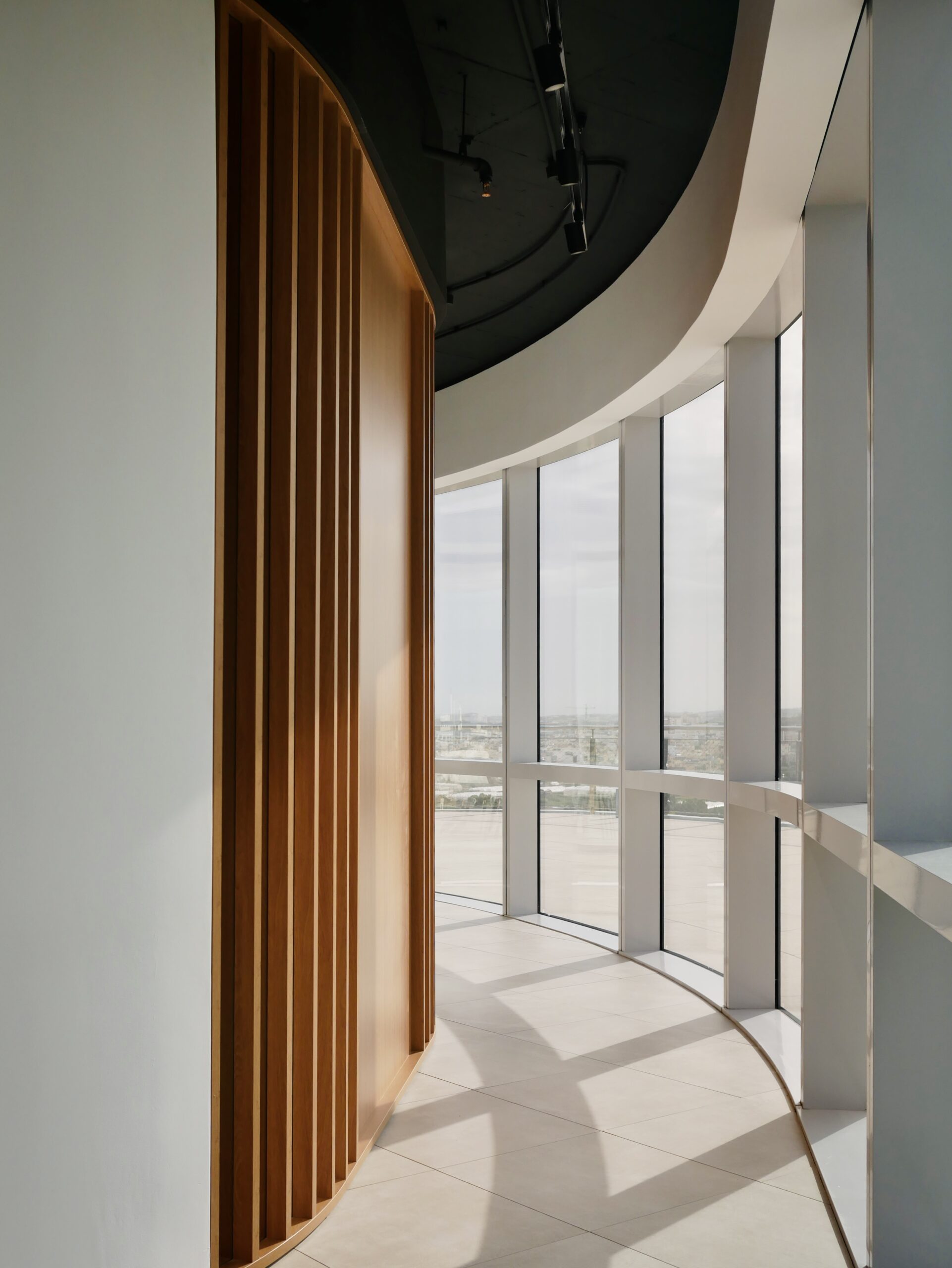 Given a unique 420 sqm space with panoramic glass walls, we used soft curves to define the layout. A “loop corridor” is the central pathway, surrounded by workspaces and amenities. It features outward-facing offices, storage, printing, and wet areas. The reception area offers access to waiting areas and boardrooms, while employee workstations and a south-facing kitchenette with a terrace are opposite. To distinguish spaces, elegant dark marble tiles and white soffits are used for guest areas, while employee spaces feature less formal stone tiles and exposed services.